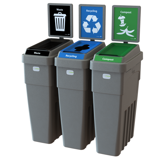 Vendor:CleanRiver Recycling SolutionsLeanStream™ 3-Stream Waste + Recycling + Compost Container – Grey – No Backboard – 69 Gallon