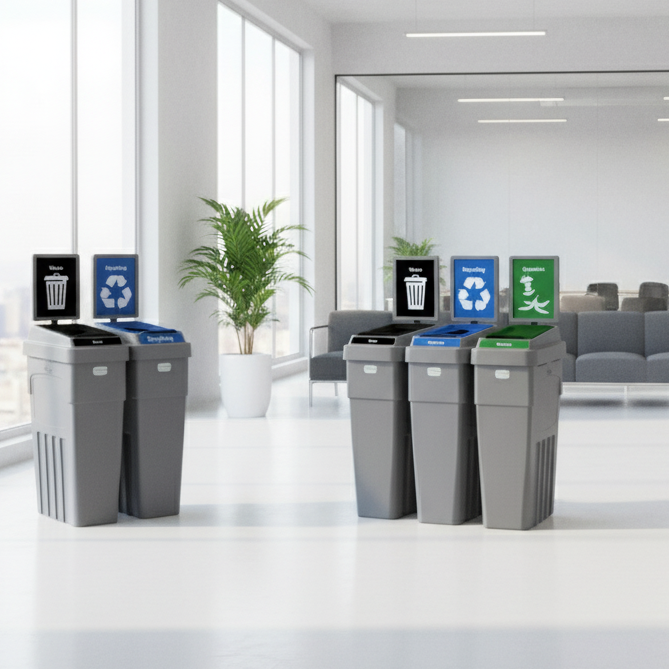 Vendor:CleanRiver Recycling SolutionsFlex E™ 3-Stream Waste + Recycling + Compost Bin – Grey – With Backboard – 50 Gallon